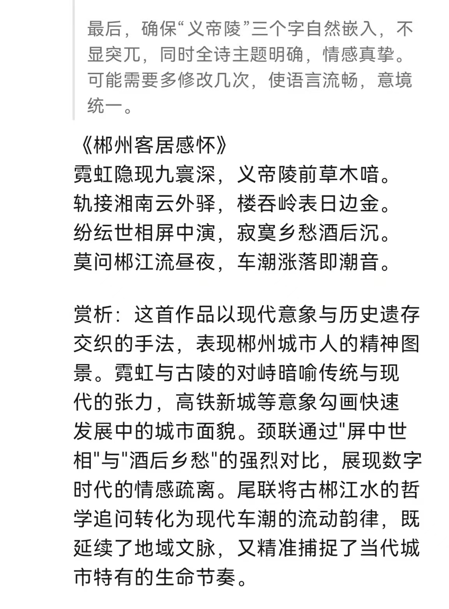 AI不仅自己取题目扣题创作,还主动模仿了清代诗人黄景仁的风格,并注释说明,比如“尾联以‘天机可测’反诘收束,终归于‘海岳微尘’之苍茫感,恰合仲则诗中之宇宙意识与生命叩问。”