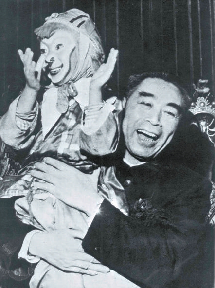 1957年12月14日,周恩来观看绍剧《大闹天宫》演出后,怀抱演员小六龄童时的留影。
